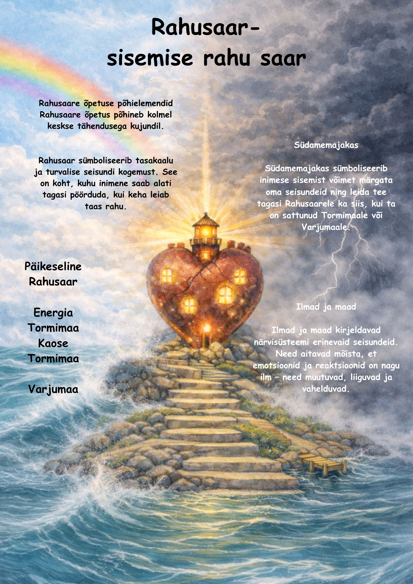 Südamemajakas sümboliseerib inimese sisemist võimet märgata oma seisundeid ning leida tee tagasi Rahusaarele ka siis, kui ta on sattunud Tormimaale või Varjumaale.